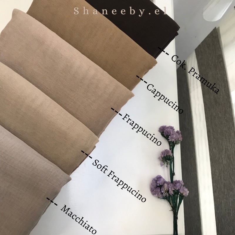 Produk ini memiliki 23 Variasi Warna yaitu : Ivory,Dark grey,Milo,Capucino,Frapucino,Milo tua,Coklat pramuka,Abu clay,Abu muda,Hazelnut,Oatmeal,Caramel,Soft Frapucino,Golden Beige,Cafe latte,Oyster,Beige,Tiramisu,Machiato,Mocca,Taupe,Khaki,Espresso,